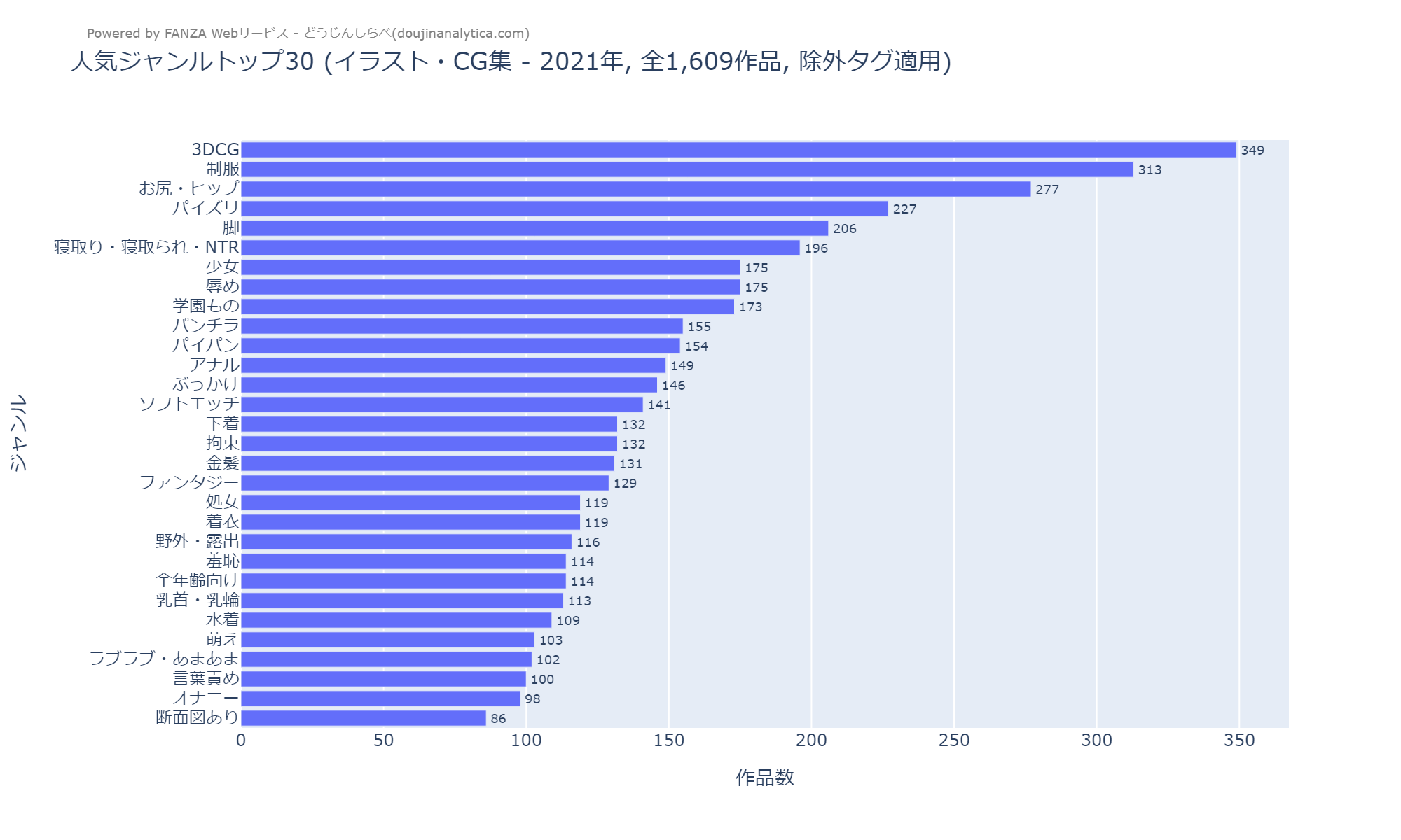 - 除外対象: 分析ノイズとなる汎用タグ(「おっぱい」「中出し」「男性向け」など)はランキングから除外