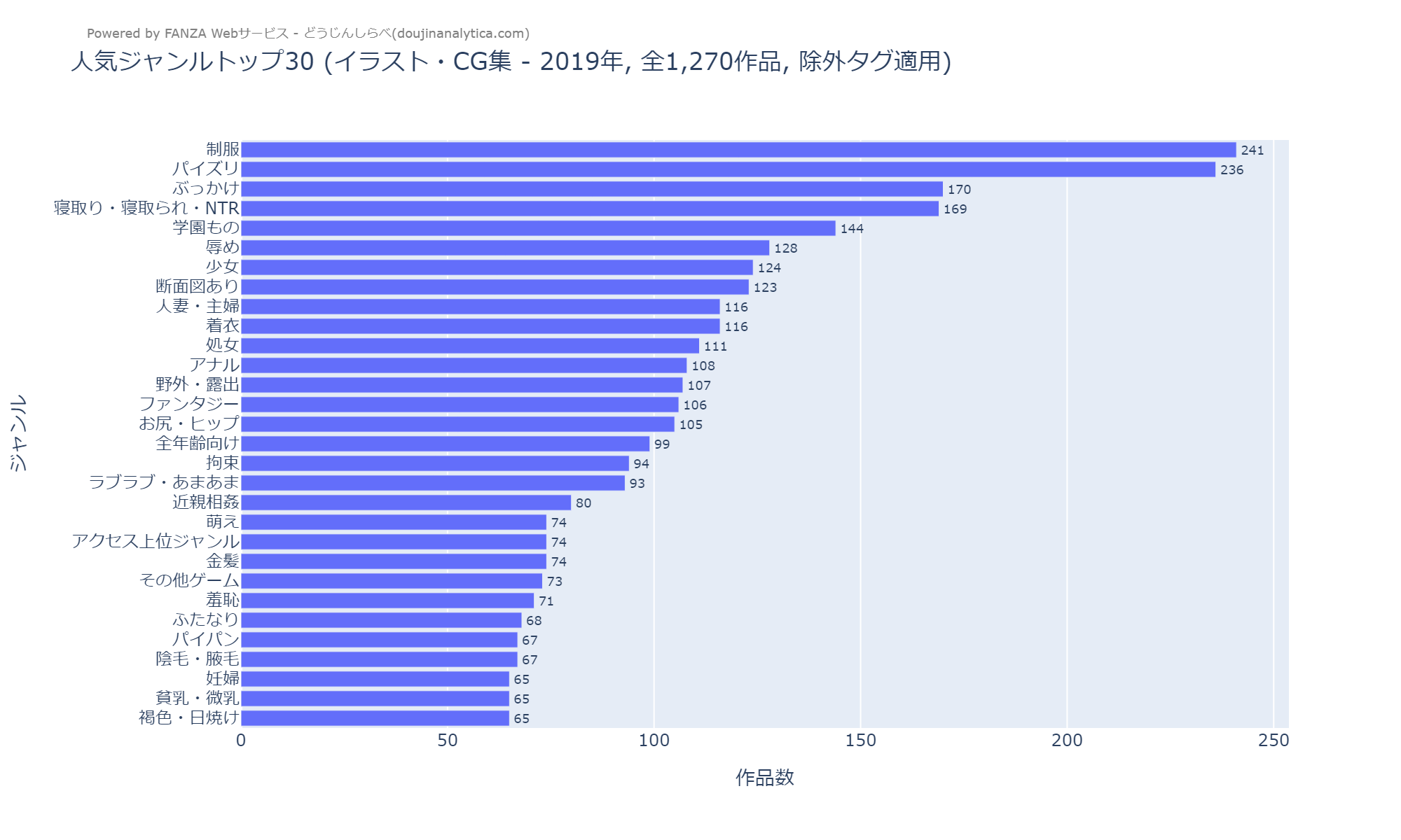 2020年、「パイズリ」が約237作品で初めて首位に立ちました。「制服」も約231作品で2位と僅差。「ぶっかけ」が約173作品で3位を維持。「NTR」は約131作品で8位に後退しています。「野外・露出」は約95作品で19位と、まだ上位10位内には入っていませんでした。ジャンル分布は前年からの大きな変化はありません。