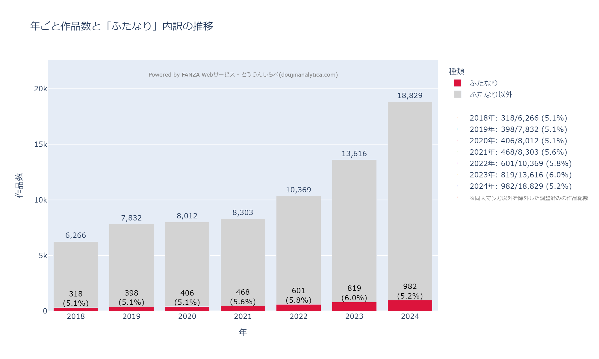 - 2024年: 総作品数 18,829件 → ふたなり作品数 982件 (割合 5.2%)