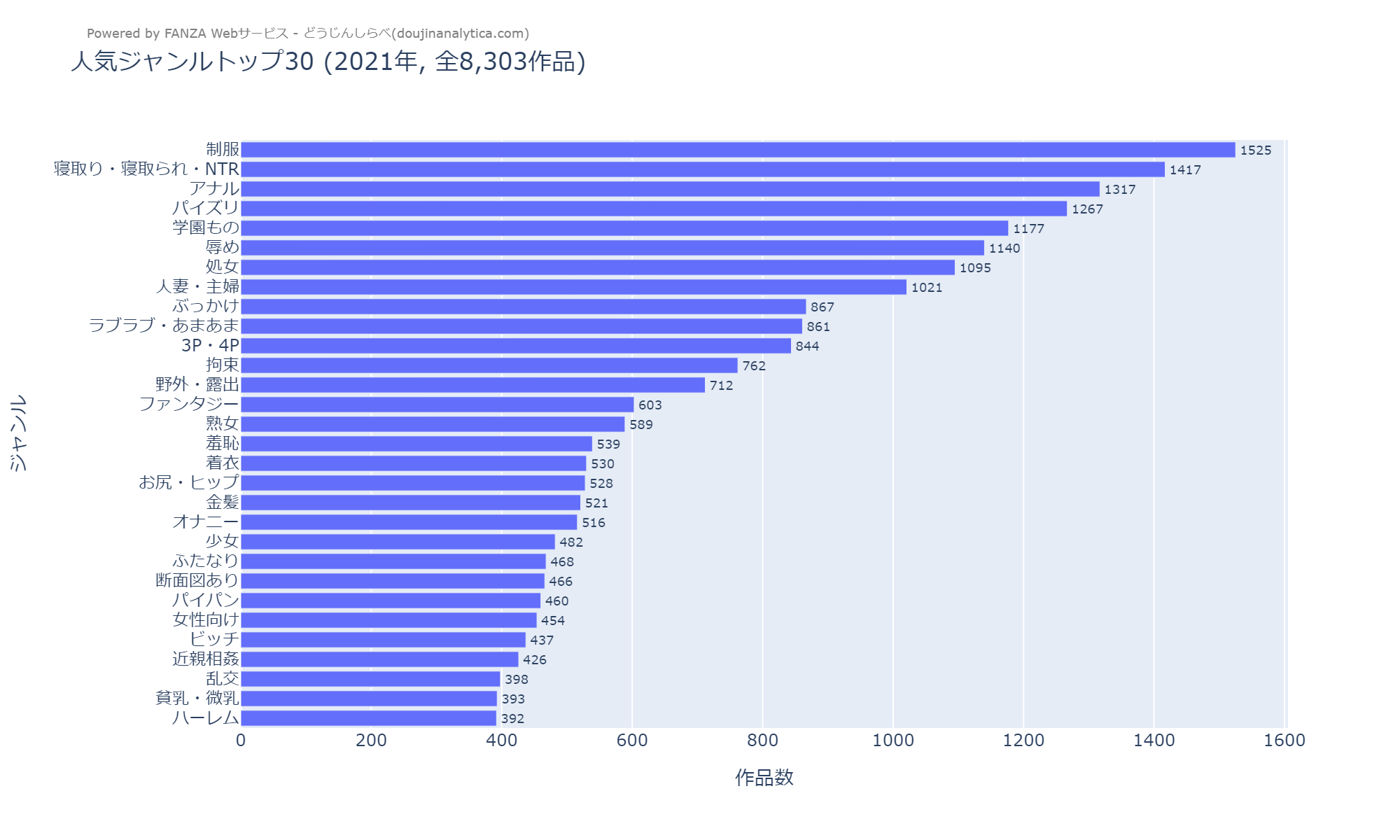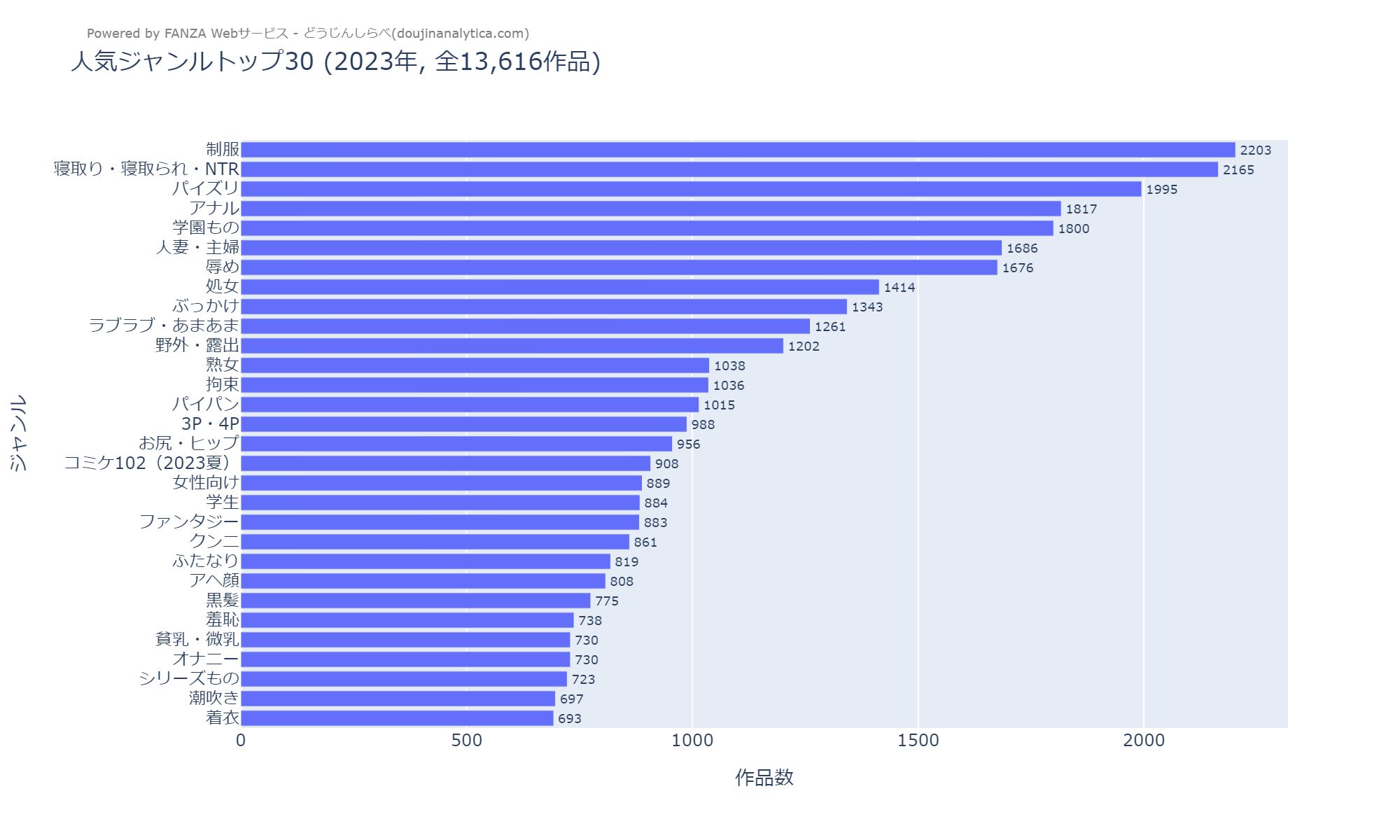406作品と微増ながら、ランキングは28位に後退。この年は他のジャンル(特に「パイズリ」や「アナル」など)が大きく成長したため、相対的に順位が下がったと考えられます。ただし作品数自体は増加しており、需要の基盤は維持されています。