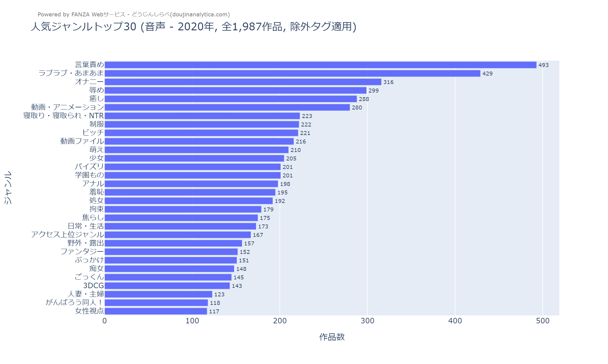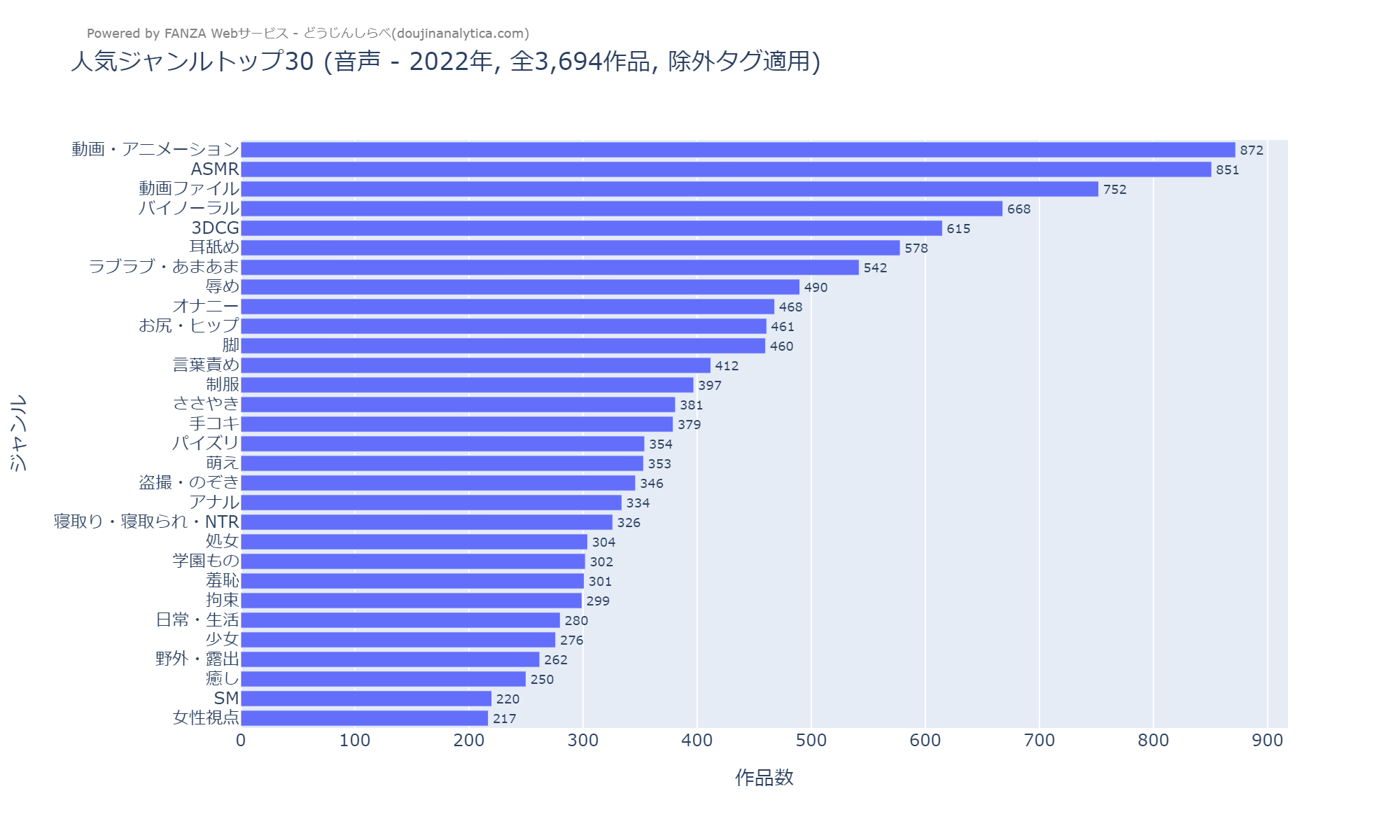 - 除外対象: 分析ノイズとなる汎用タグ(「おっぱい」「中出し」「男性向け」「音声付き」など)はランキングから除外
