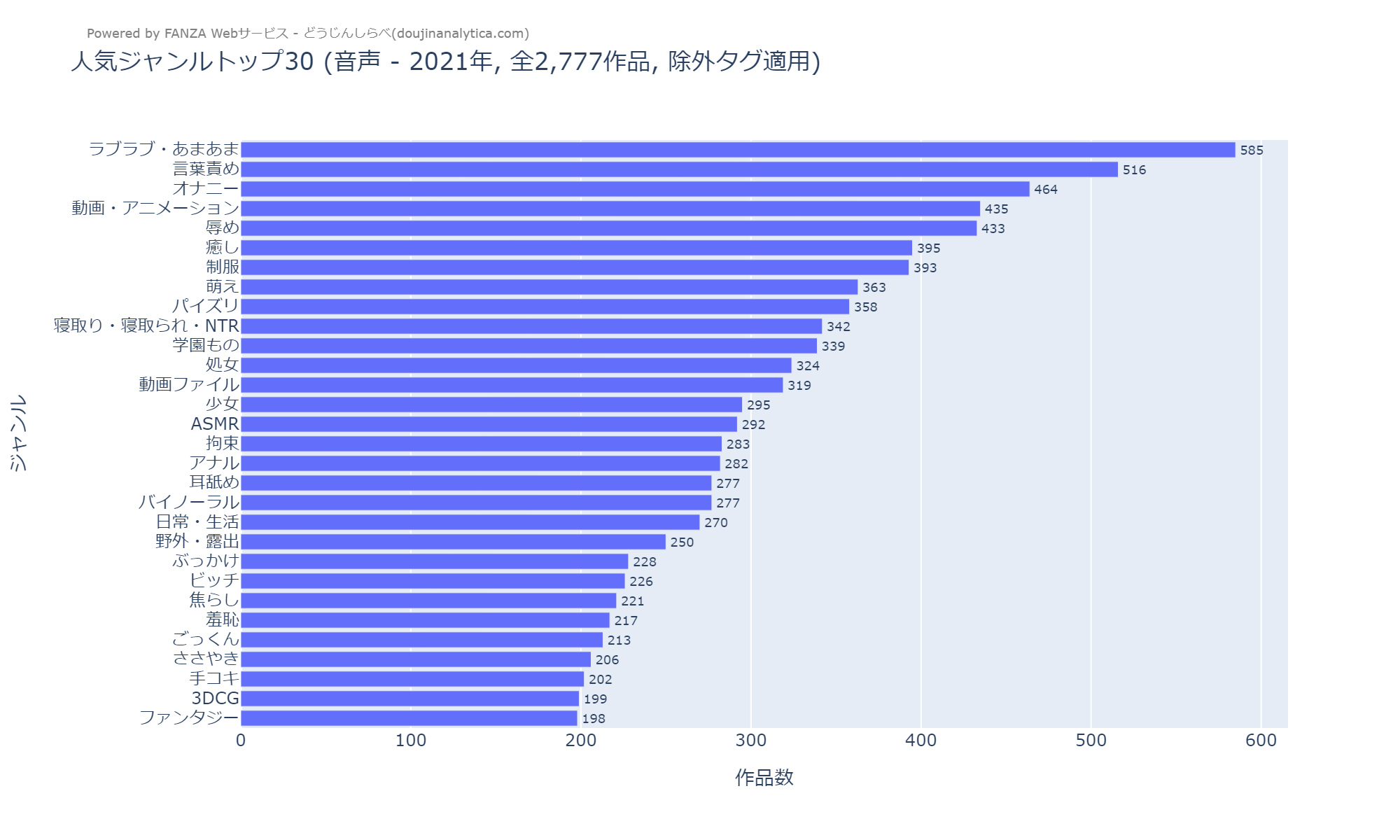 市場初期。「言葉責め」「ラブラブ・あまあま」が他を圧倒。「ASMR」「バイノーラル」はまだ圏外。NTRは12位。