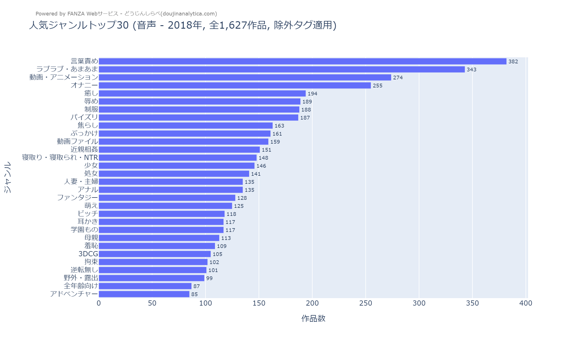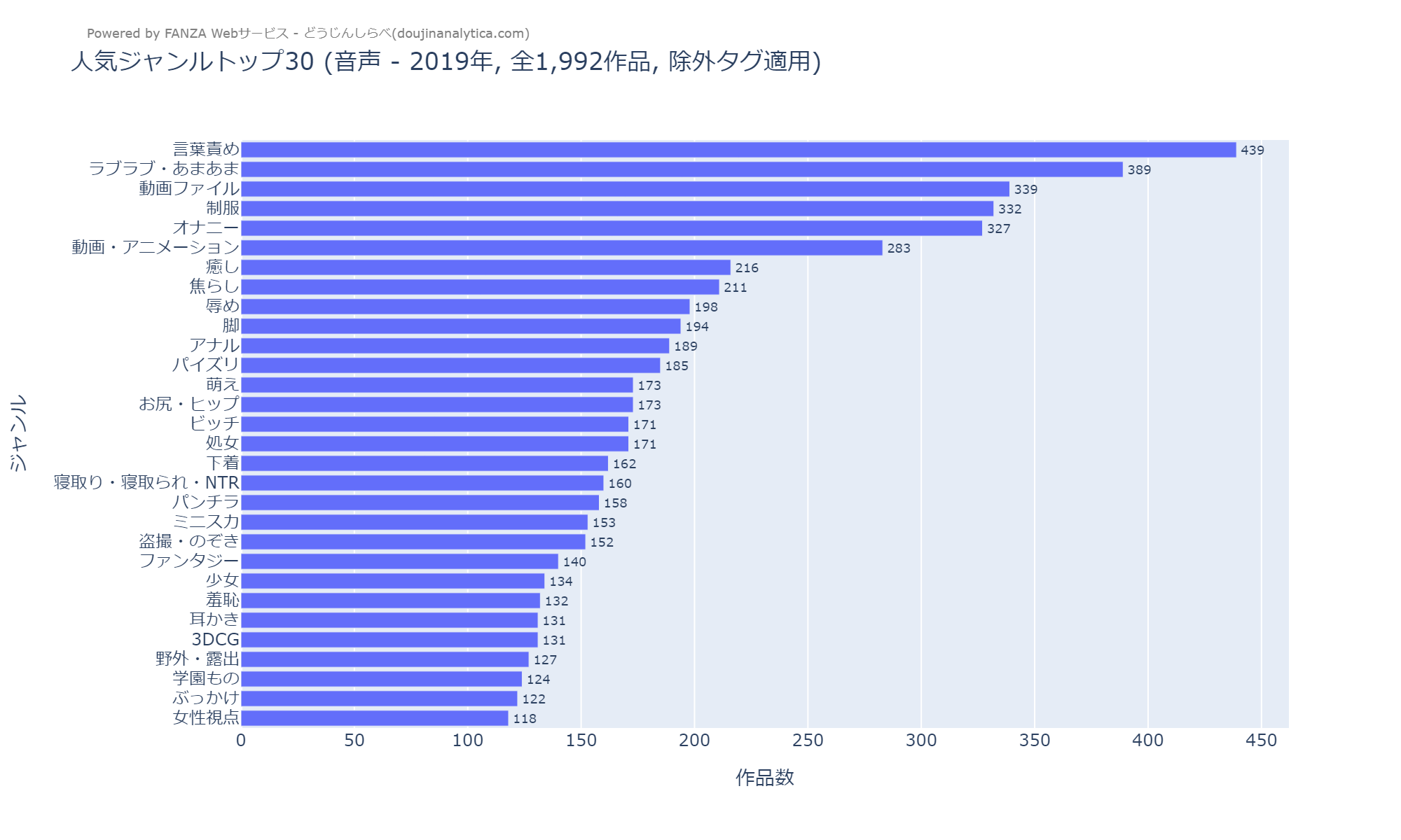 - 対象: 2018年~2024年にFANZAでリリースされた「音声」キーワードで取得した同人作品(総数28,050作品)